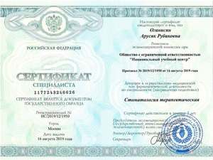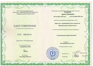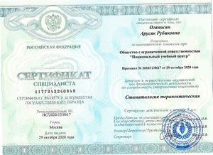 - 2020, Москва, ООО «Национальный учебный центр», стоматология общей практики, специальность «Врач стоматолог-общей практики».