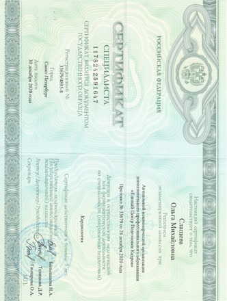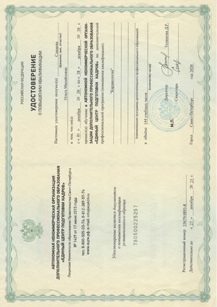 - 2019, Москва, Центр повышения квалификации и профессиональной переподготовки, курс: «Повышение квалификации по терапии».