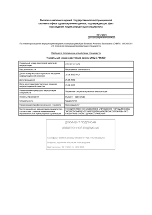 - 2022, Москва, НИИ им. Н.В Склифосовского, специальность «Врач-кардиолог».