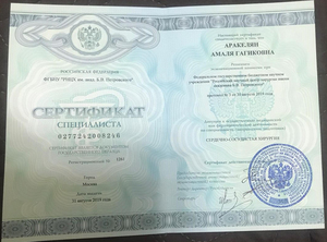 - 2020, Москва, ФГБУ ГНЦ ФМБЦ им. А.И. Бурназяна ФМБА России, специальность «Ультразвуковая диагностика».