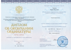 - 2020, Москва, "Российский национальный исследовательский медицинский университет имени Н.И. Пирогова", специальность "Врач-оториноларинголог";