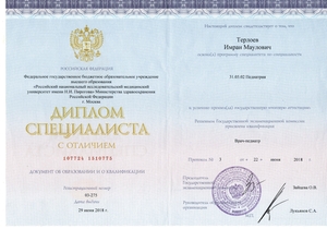 - 2018, Москва, Москва, "Российский национальный исследовательский медицинский университет имени Н.И. Пирогова", специальность "Врач-педиатр";