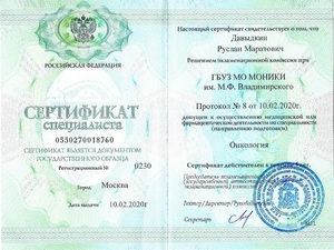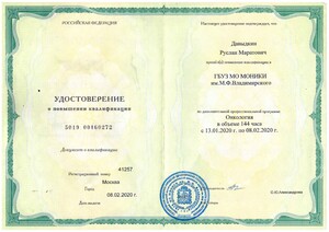 - 2020, Москва, МОНИКИ, специальность «Онкология»;
