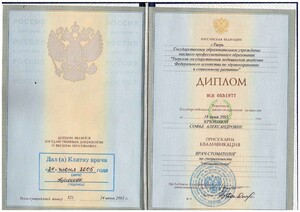 - 2006, ГОУ ВПО «Тверская ГМА», специальность «Стоматология»;