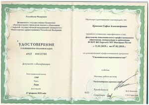 - 2018, Тверь, Тверская государственная медицинская академия, повышение квалификации, Стоматология терапевтическая;
