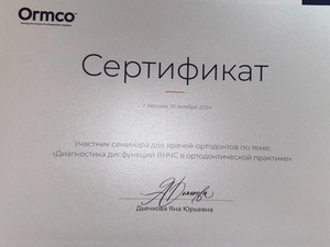 - 2024, Диагностика дисфункций ВНЧС в ортодонтической практике, лектор Дьячкова Яна Юрьевна Ormco;