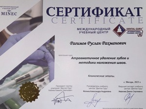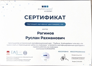 - 2023, Продвинутый курс по имплантации. Костная пластика и синус-лифтинг (Клинические этапы). Международный учебный центр Dental Guru;