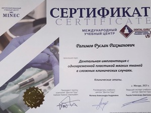 - 2023, Дентальная имплантация с одновременной пластикой мягких тканей в сложных клинических случаях. Международный учебный центр Dental Guru;