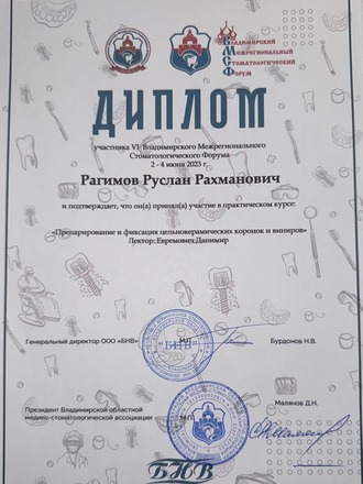 - 2023, Препарирование и фиксация цельнокерамических коронок и виниров. «Владимирский Межрегиональный Стоматологический Форум». Лектор: Евремович Данимир;
