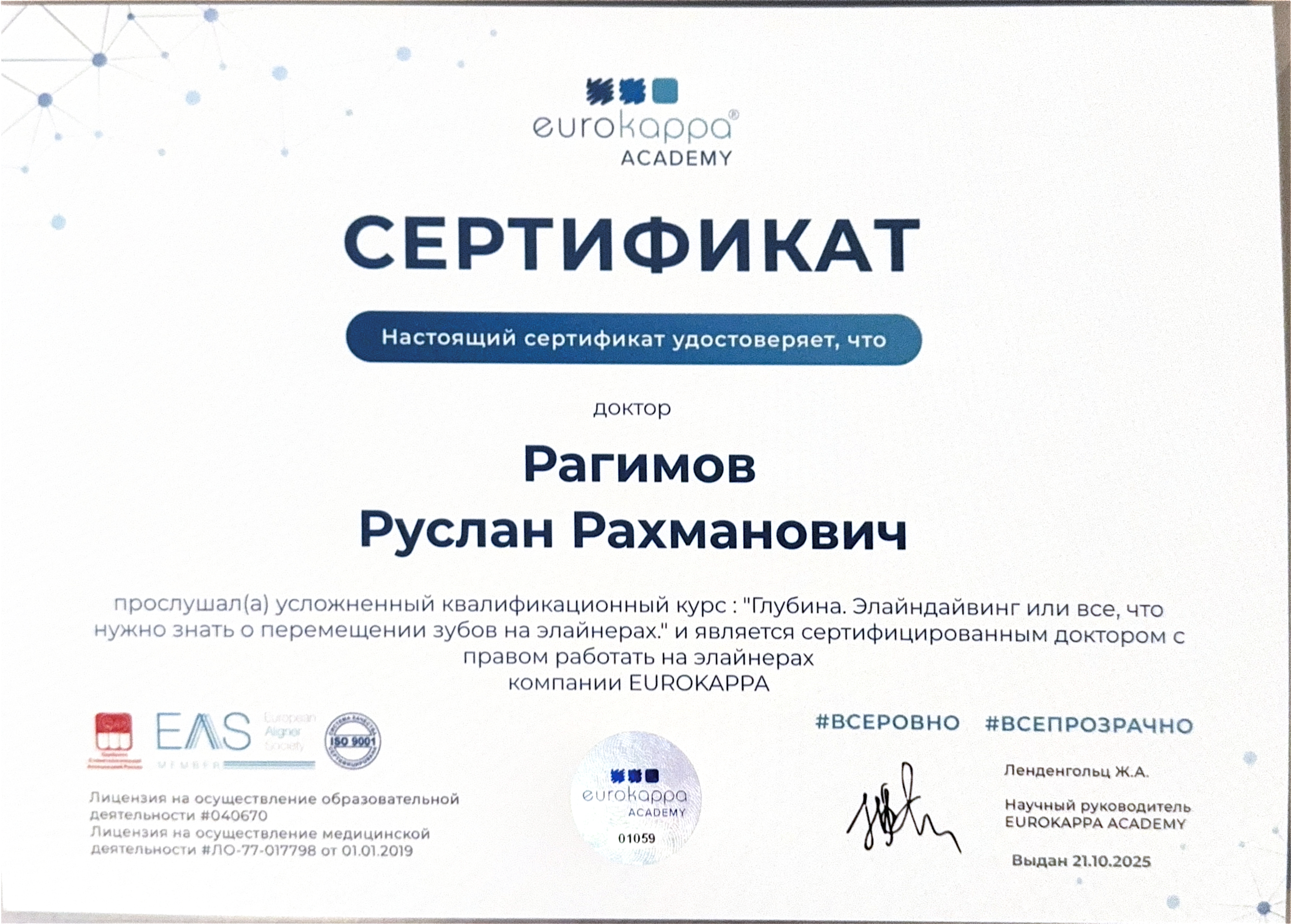 - 2024, Сертификационный курс по лечению на Элайнерах 3D Smile;