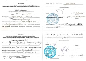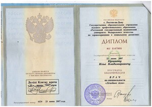 - 2007, Ростов-на-Дону, Ростовский Государственный медицинский университет, специальность «Врач»;