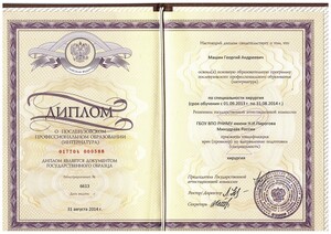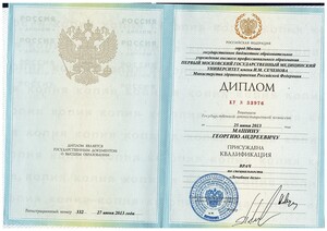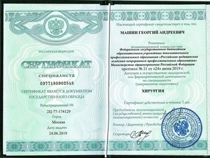 - 2014, РНИМУ им. Н.И. Пирогова на базе ГКБ №57, специальность «Врач-хирург»;
