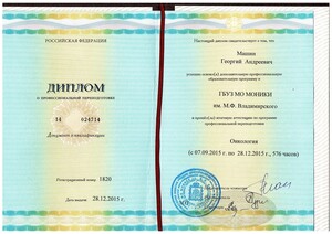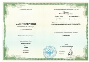 2015,ГБУЗ МО МОНИКИ им. М.Ф. Владимирского, сертификат по специальности «Онкология».