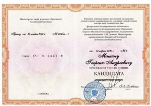 2020, Первый МГМУ им. И.М. Сеченова, защита диссертации на соискание ученой степени кандидата медицинских наук на тему «Органосохраняющие пособия при интрасинусных новообразованиях почки».