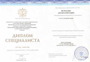 - 2023, Москва, Первый Московский Государственный Медицинский Университет имени И.М. Сеченова, специальность «Лечебное дело»;