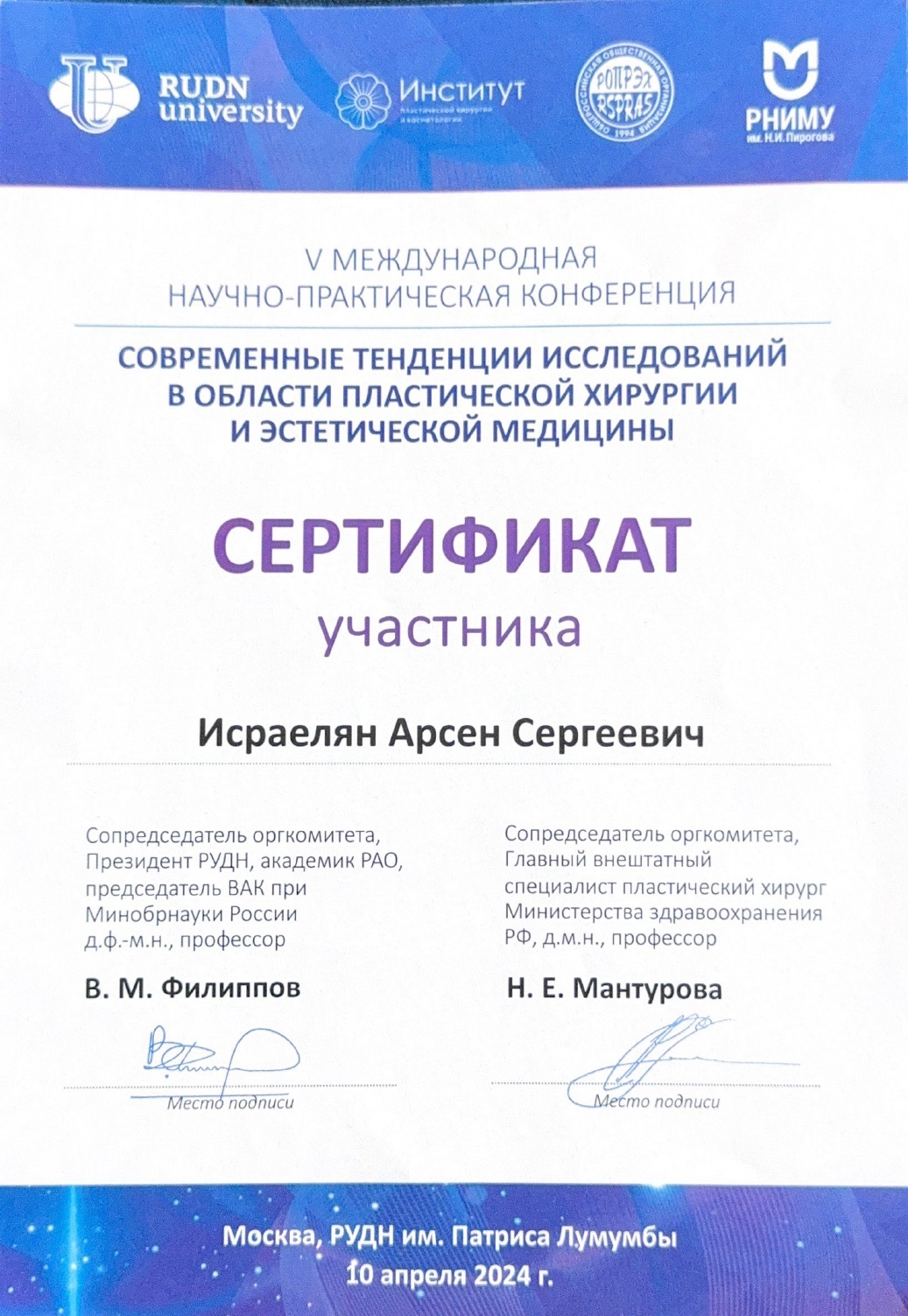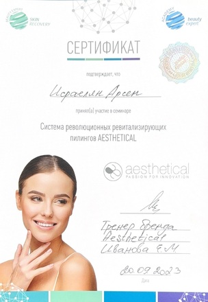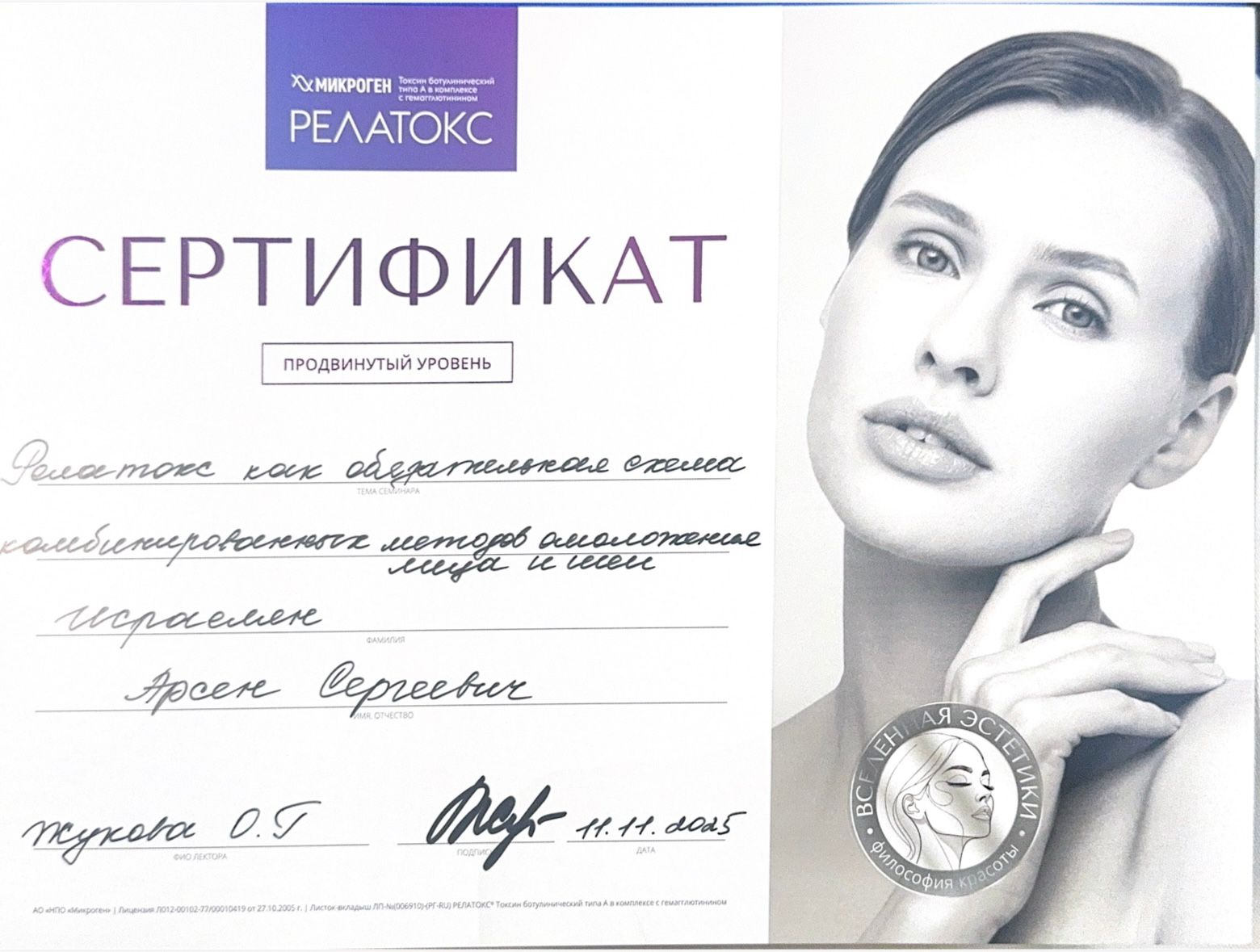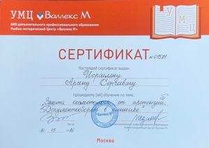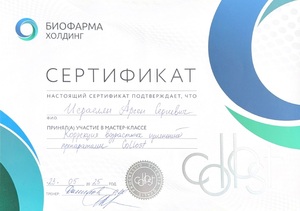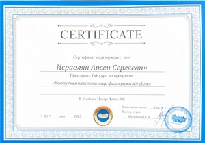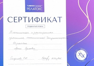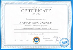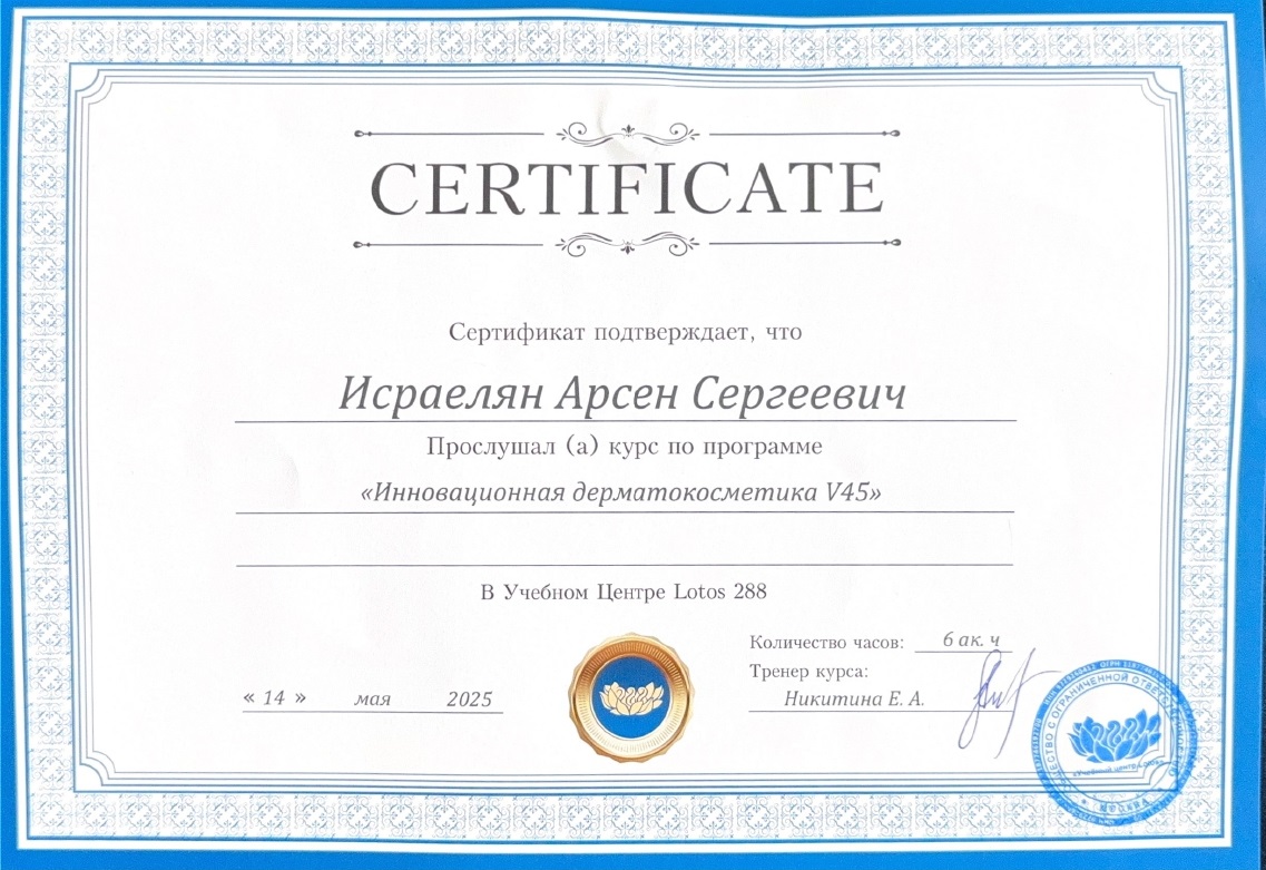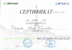 - 2025, Москва, Ипсен, курс «Применение препарата Диспорт в эстетической медицине»;