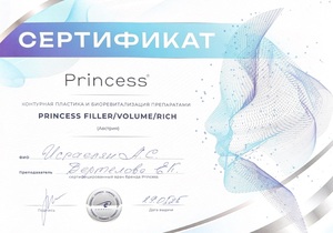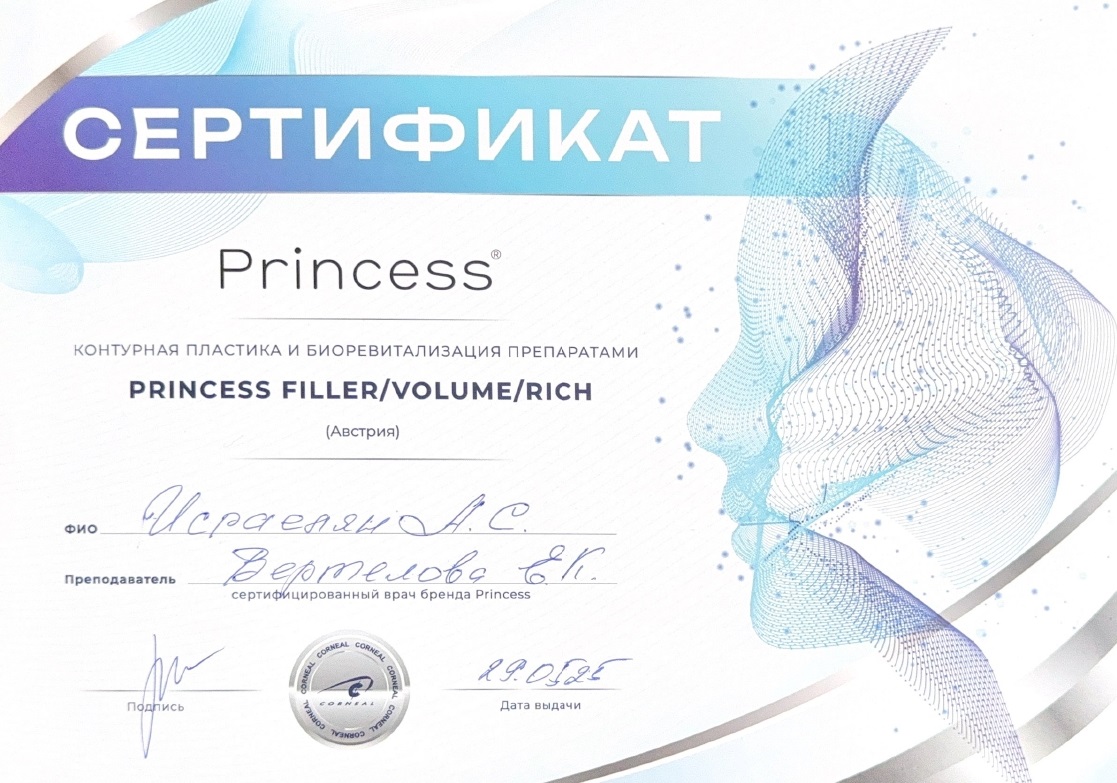 - 2025, Москва, Корнеаль, курс «Контурная пластика и биоревитализация препаратами Princess filler/volume/rich»;