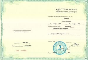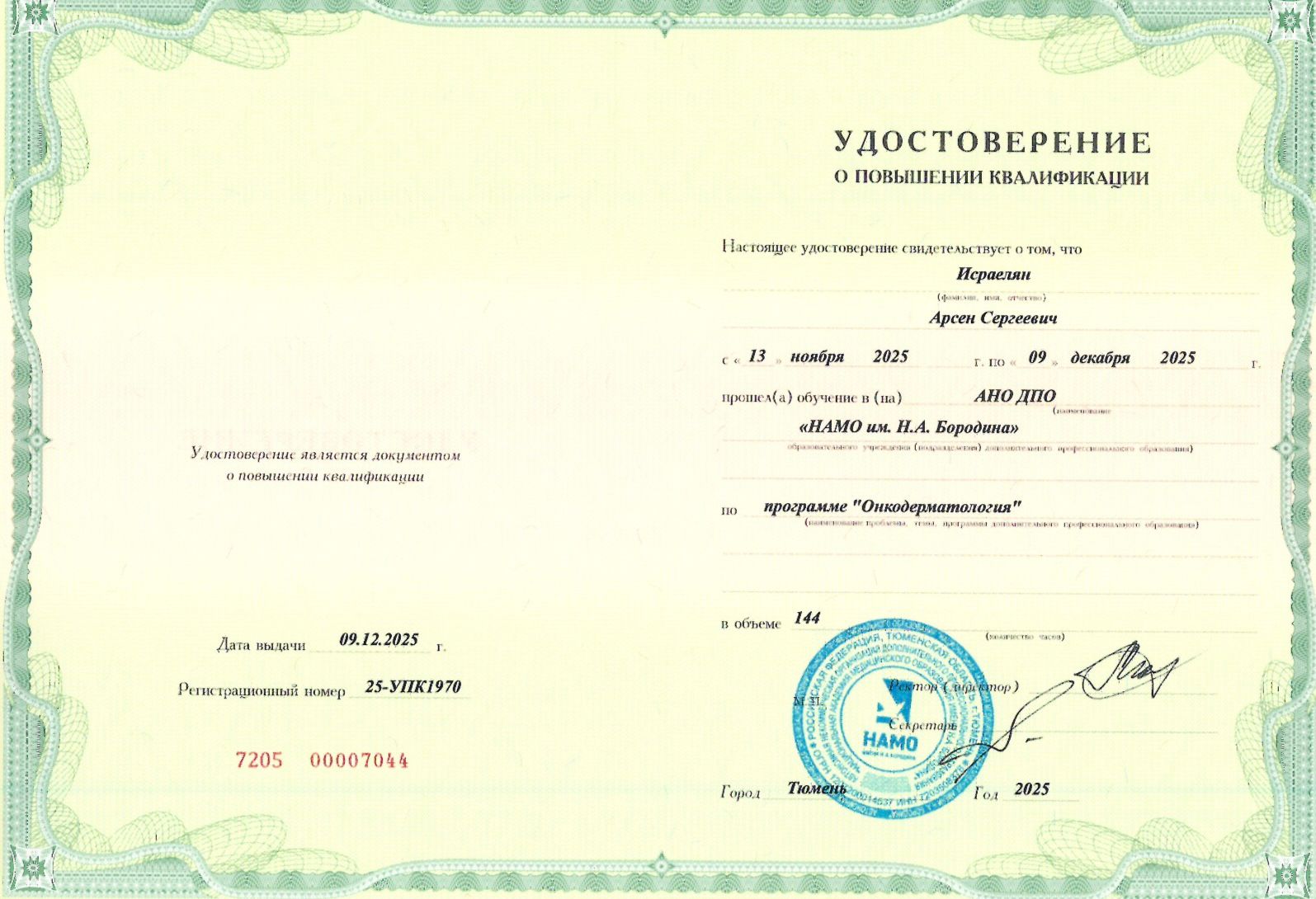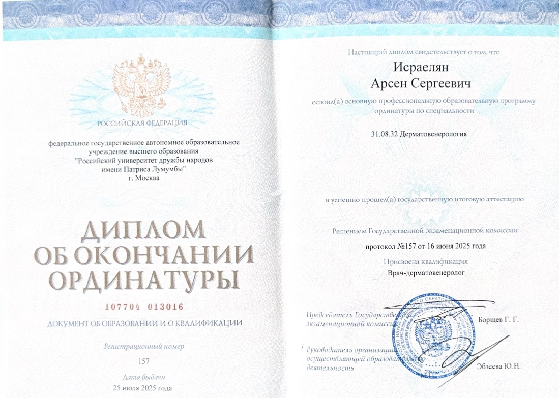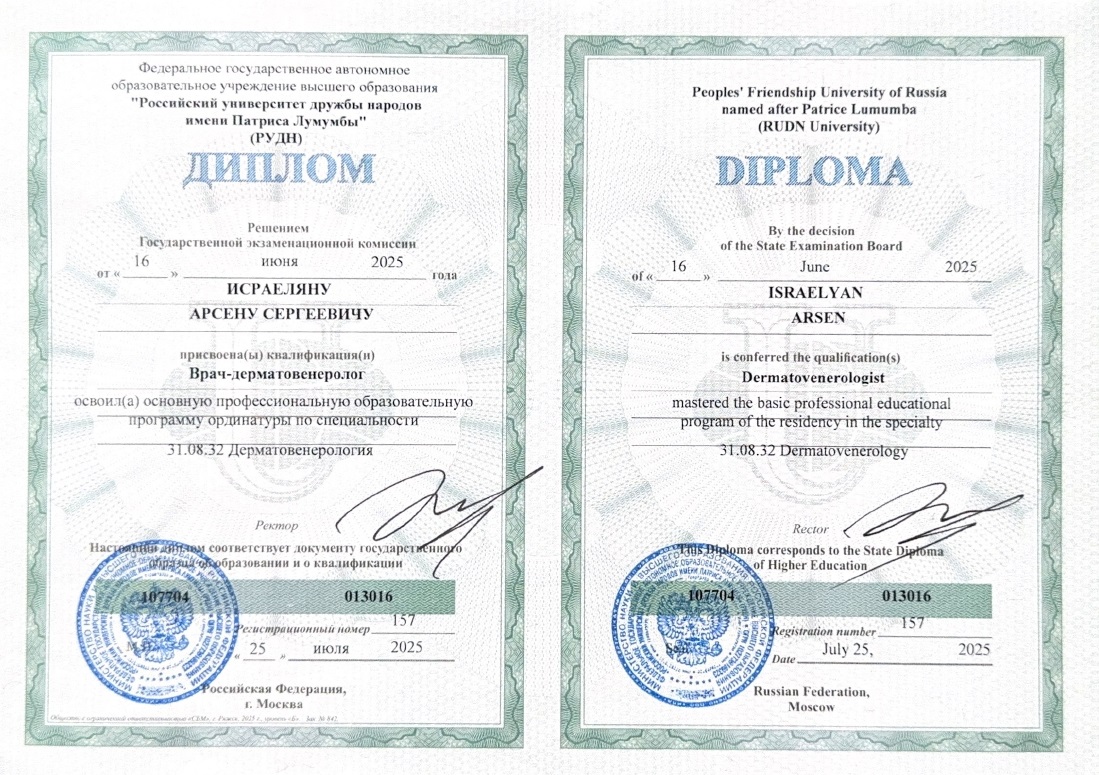 - 2025, Москва, Российский Университет Дружбы Народов, специальность «Дерматовенерология».