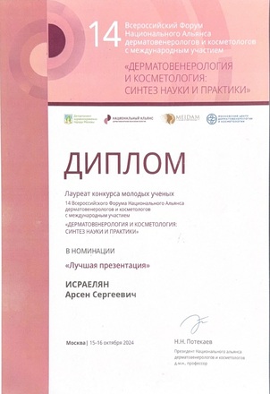 - 2024, Москва, Форум Национального Альянса Дерматовенерологов и косметологов. Победитель конкурса молодых ученных с темой доклада «Манифестация псориаза, имитирующего псориаз после сочетанной пластической операцией», номинация «лучшая презентация»;