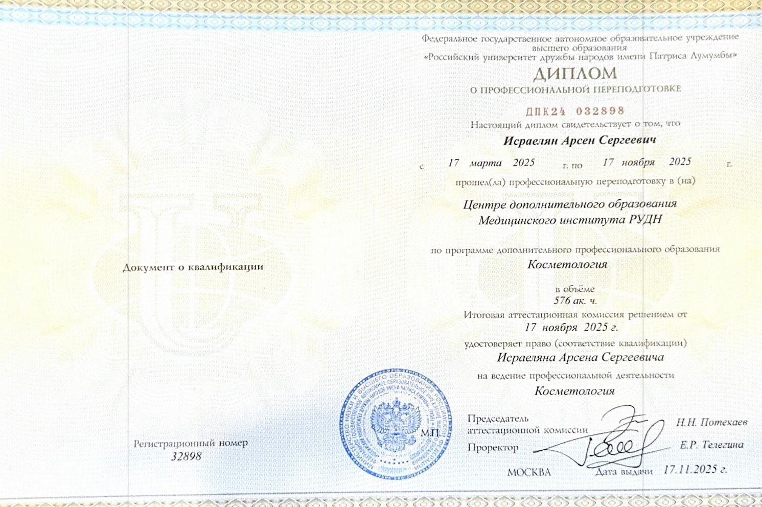 - 2025, Москва, Российский Университет Дружбы Народов, специальность «Косметология».