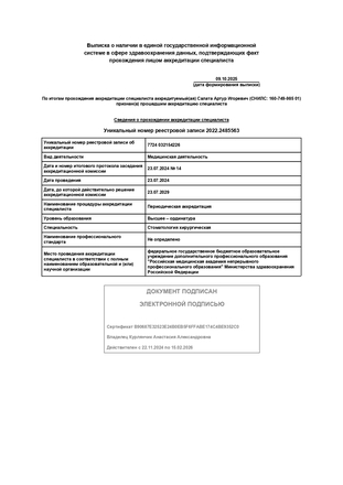 - 2024, Москва, Российская медицинская академия непрерывного профессионального образования, специальность «Стоматология хирургическая».