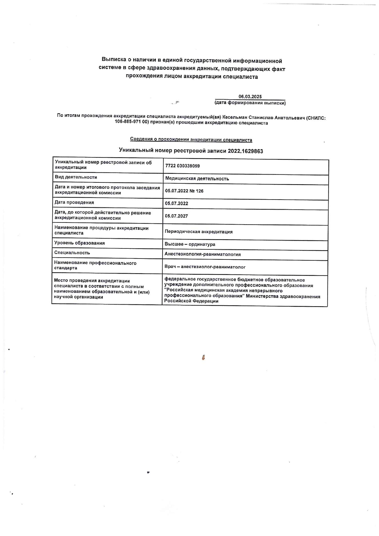2022, Сертификат по специальности «Анестезиология и реанимация».