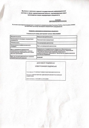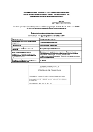 - 2007, Российская медицинская академия последипломного образования, профессиональная переподготовка по специальности «Ультразвуковая диагностика».