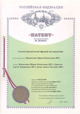 - 2022, Москва, Патент на изобретение №2818543 "Способ динамической офисной гистероскопии";