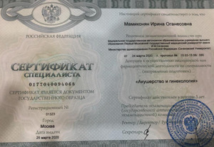 - 2020, Москва, Первый Московский государственный медицинский университет имени И. М. Сеченова, специальность «Акушерство и гинекология».