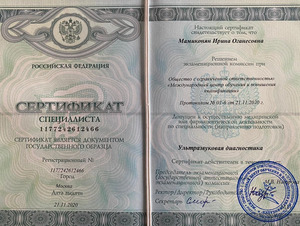 - 2020, Москва, Международный центр обучения и повышения квалификации, специальность «Ультразвуковая диагностика»;