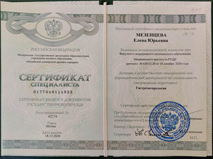 - 2011, Москва, Первичная переподготовка, РГМУ им. Н.И.Пирогова, специальность "Гастроэнтеролог";