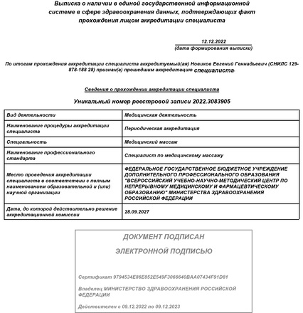 - 2013, Москва, повышение квалификации по специальности "Медицинский массаж", ментр профессиональной подготовки кадров и последипломного образования;