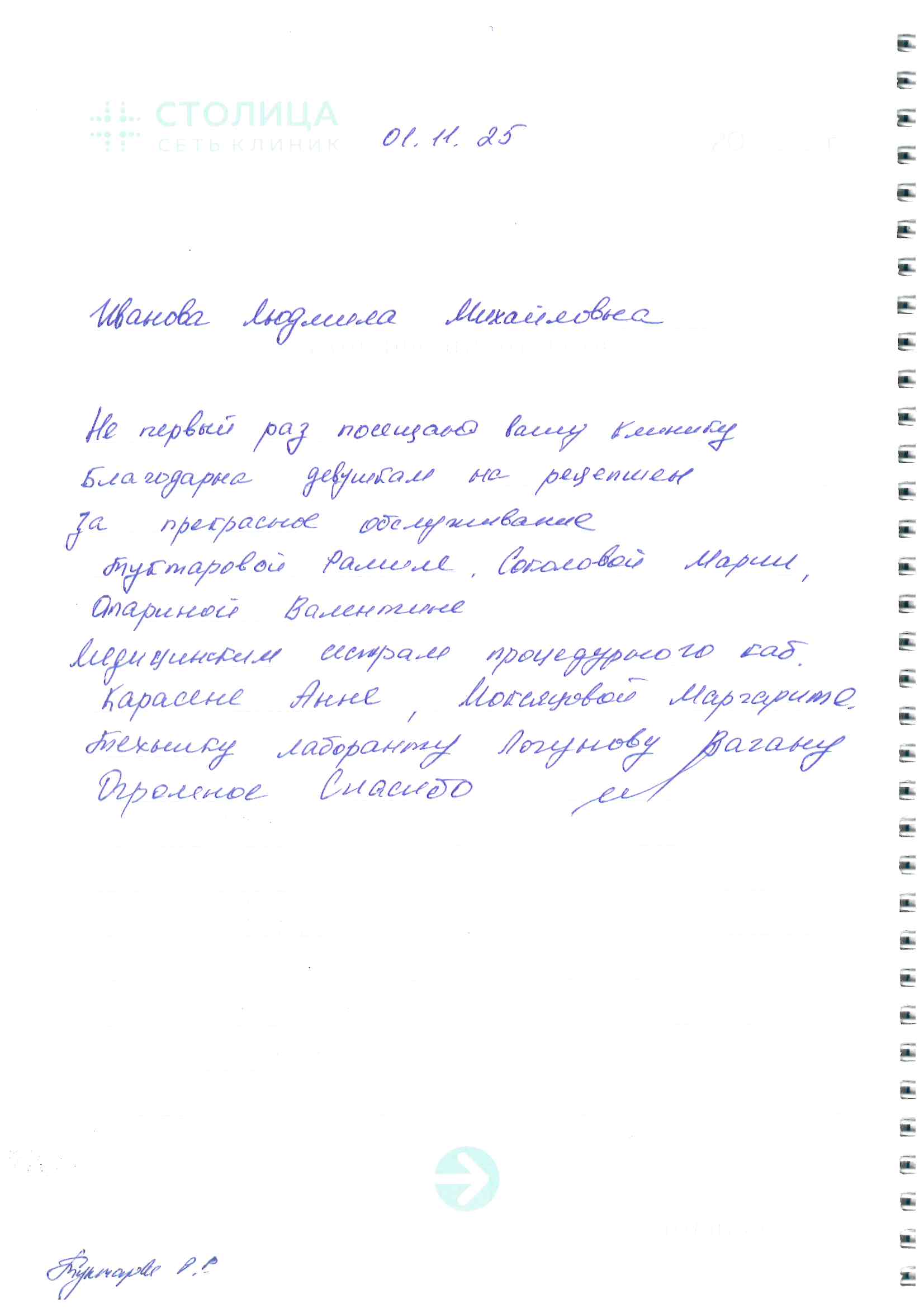 Огромное спасибо персоналу и врачам клиники «Столица» за доброе и профессиональное отношение к пациентам. Особенно хочу выразить благодарность Туктаровой Рамиле, лаборанту В.Г. и доктору Шевченко С.А. Очень хотелось бы, чтобы и другой персонал клиники равнялся на них.