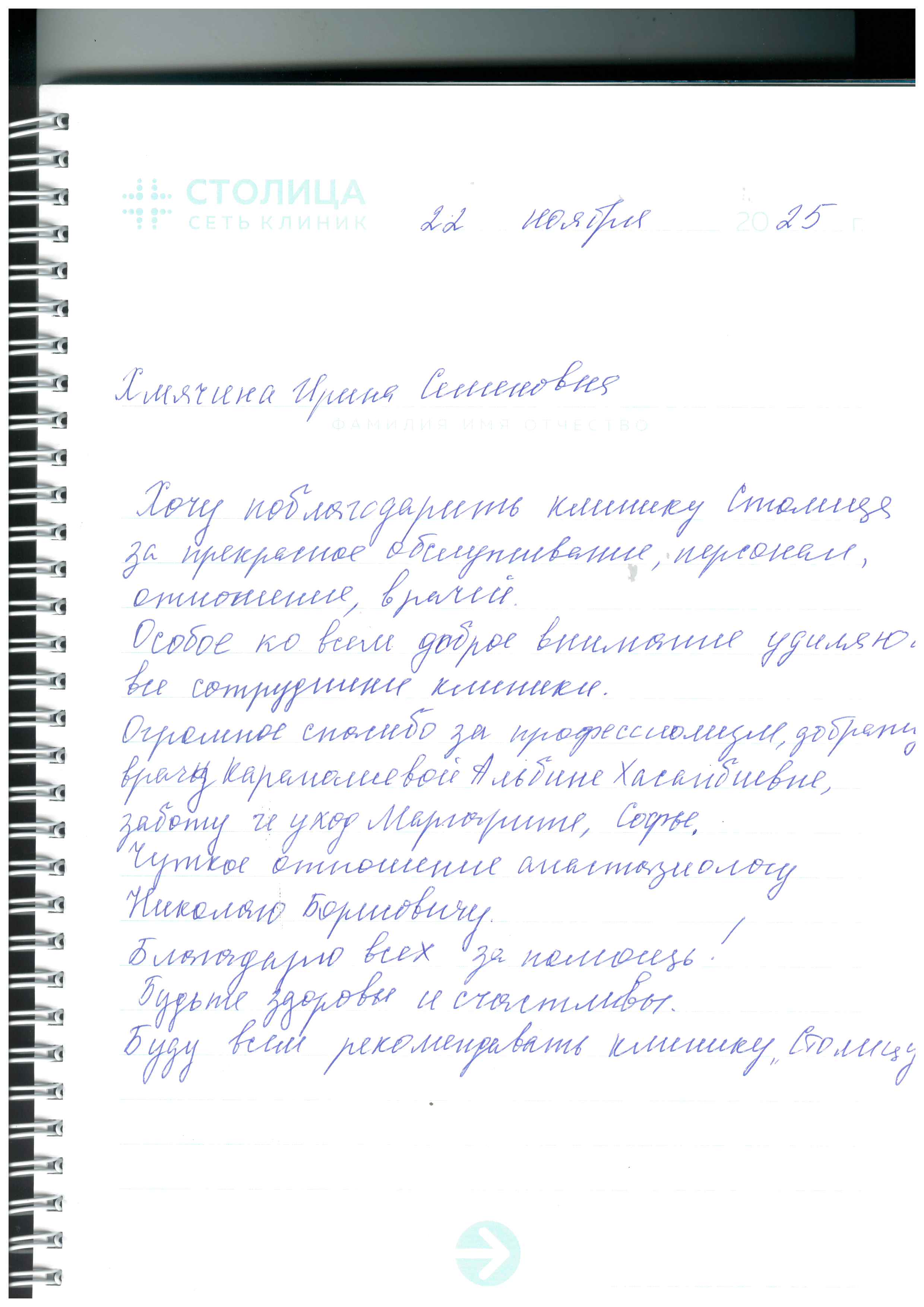 Хочу благодарить клинику Столица за прекрасное обслуживание, персонал, отношение, врачей.