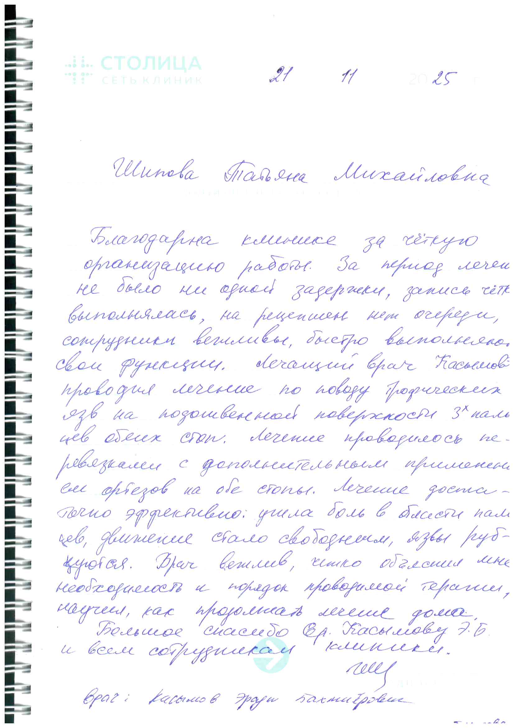 Хочу сердечно поблагодарить докторов Сафину, Легезу, Венюкову (мой куратор), Колесову. Но мне очень импонируют и очаровательные Полянская и Васильева, и «хорошенькая» Хорошун, харизматичные Евтушенко и Котова. Сейчас лечусь у чудесного (если можно так сказать о травматологе) доктора Нагучева (и надеюсь на чудо!) Большое спасибо за Вашу заботу о нас и высокий профессионализм.