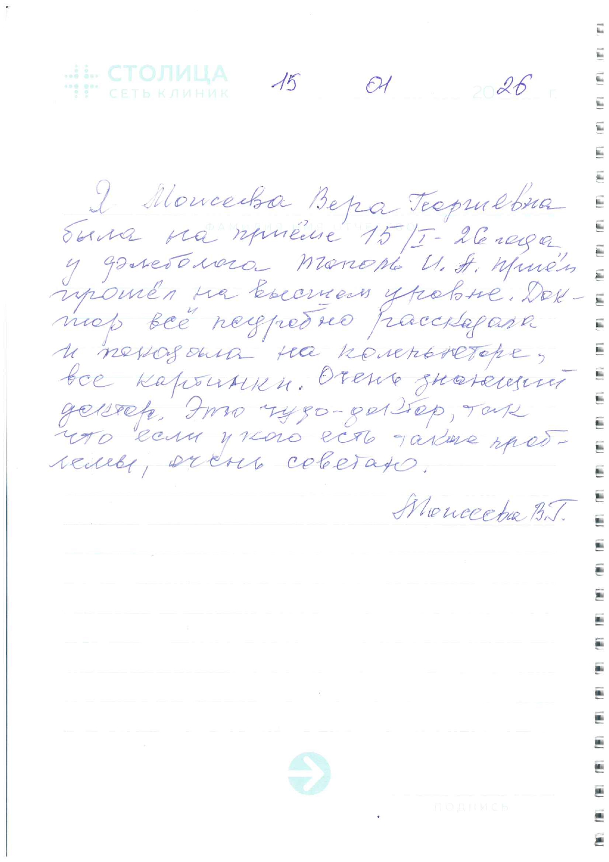 Я Моисеева Вера Георгиевна, была на приёме 15.01.2026 года, у флеболога Тополь И.А. Приём прошёл на высшем уровне. Доктор всё подробно рассказала и показала на компьютере, все картинки. Очень знающий доктор. Это чудо-доктор, так что если у кого есть такие проблемы, очень советую.