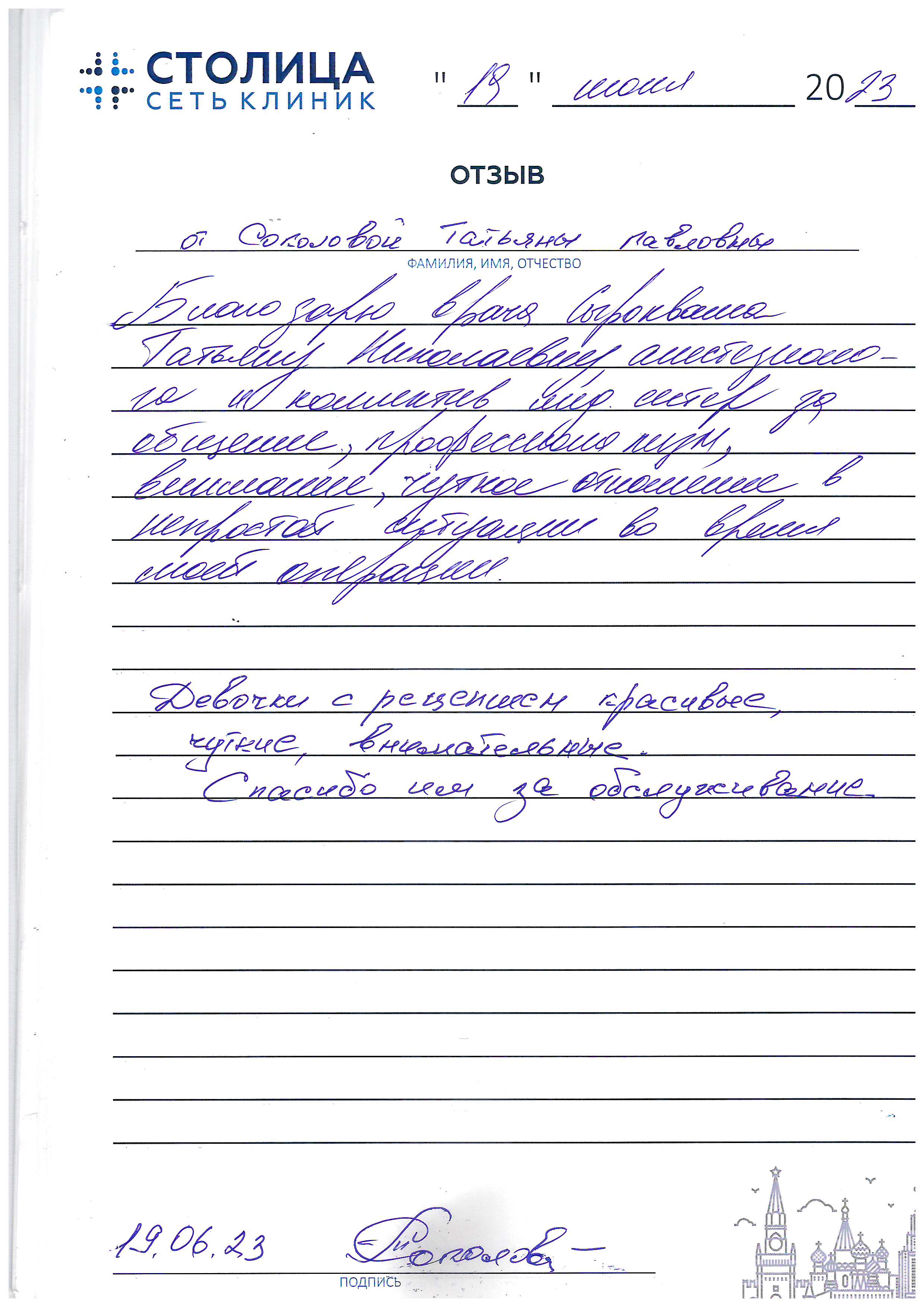 Хочу поблагодарить всех специалистов клиники «Столица». За профессионализм, внимательность, умение доступной объяснять. Закирова Зиля С., Соколова Светлана О, Мирзаахмедова Ширин М, Гагиевна Мадина В, Лопухова НЕЛЛИ Л., Клепцова МАРИНА В. Девушки группы ресепшен Чекалева ЕК.С, Шафикова Алина, Рамазанова П. Огромное всем спасибо за чуткость и особое внимание.