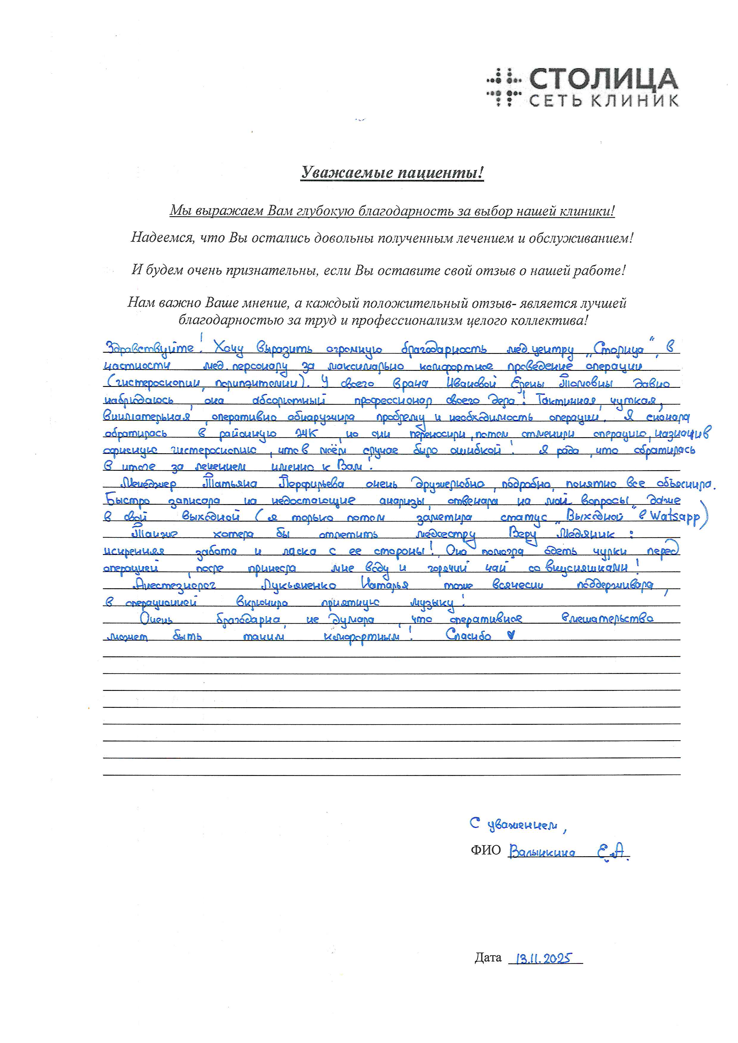 Здравствуйте! Хочу выразить огромную благодарность медицинскому центру «Столица», в частности мед. персоналу за максимально комфортное проведение операции (гистероскопии, полипэктомия). У своего врача Ивановой Елены Томовны давно наблюдаюсь, она абсолютный профессионал своего дела! Тактичная, чуткая, внимательная, оперативно обнаружила проблему и необходимость операции. Я сначала обратилась в районную, но они переносили, потом отменили операцию, назначив офисную гистроскопию, что в моем случае было ошибкой! Я рада что обратилась в итоге за лечением именно к вам!