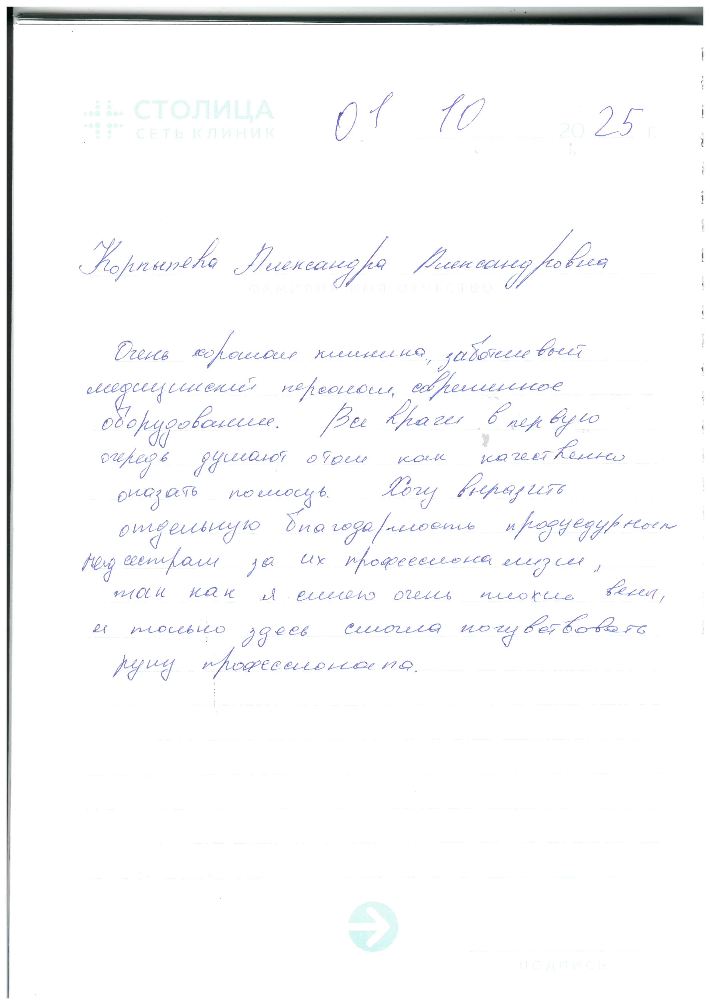 Большая благодарность процедурной медсестре Тюгаевой Светлане за отличную, высокопрофессиональную работу.